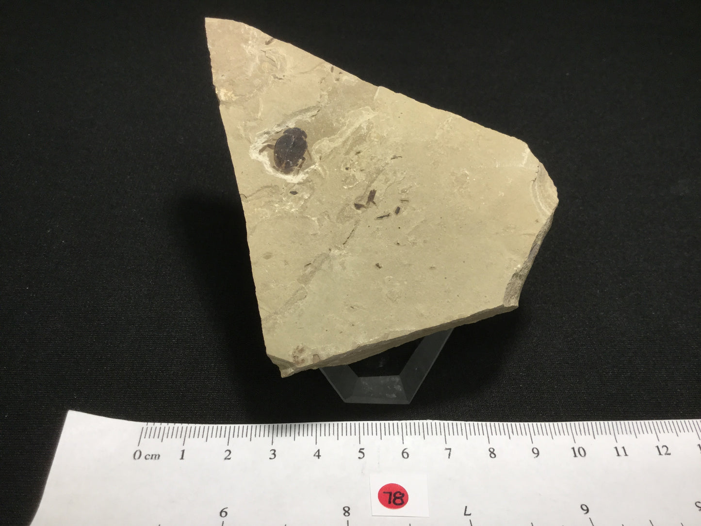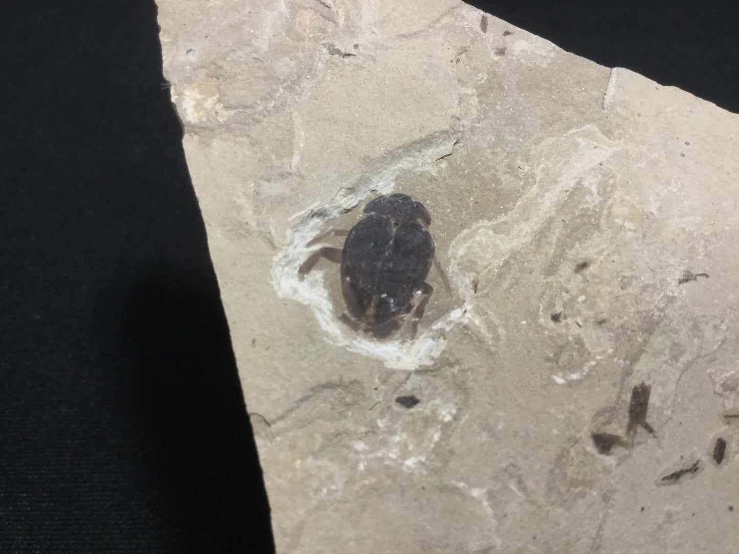 This is an exception fossil beetle from the locality. The elytra are closed but several legs are preserved. The head is complete.