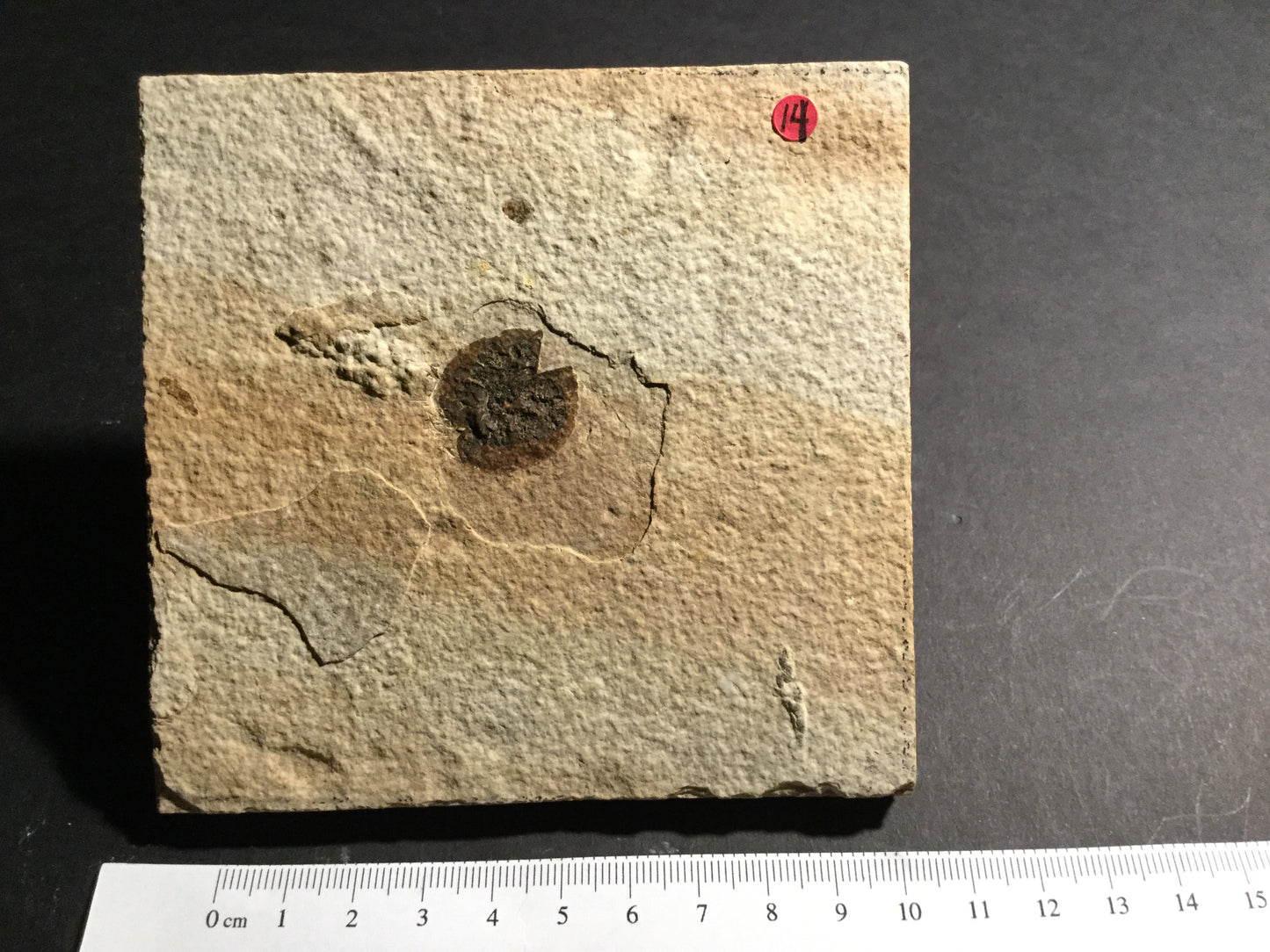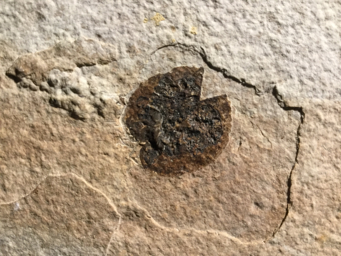 This is an excellent fossilized nut found in the 18-inch layer. The detail is outstanding and shows a husk layer as well as the preserved seed. The fruit is 2 cm across.