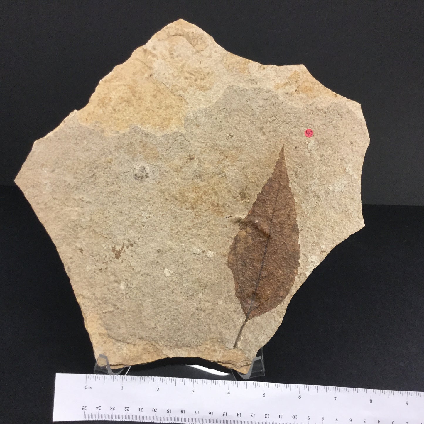 This is a beautiful leaf from the Family Juglandaceae and is a relative to the walnut. The specimen has very good venation and the margin detail is well defined. This example is collected from the 18-inch layer.