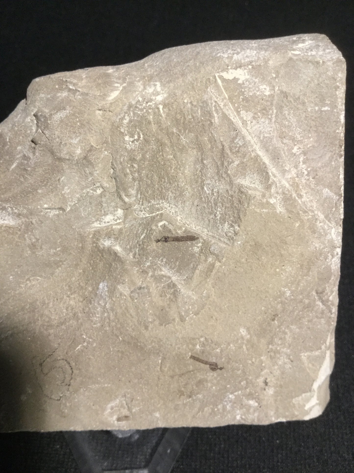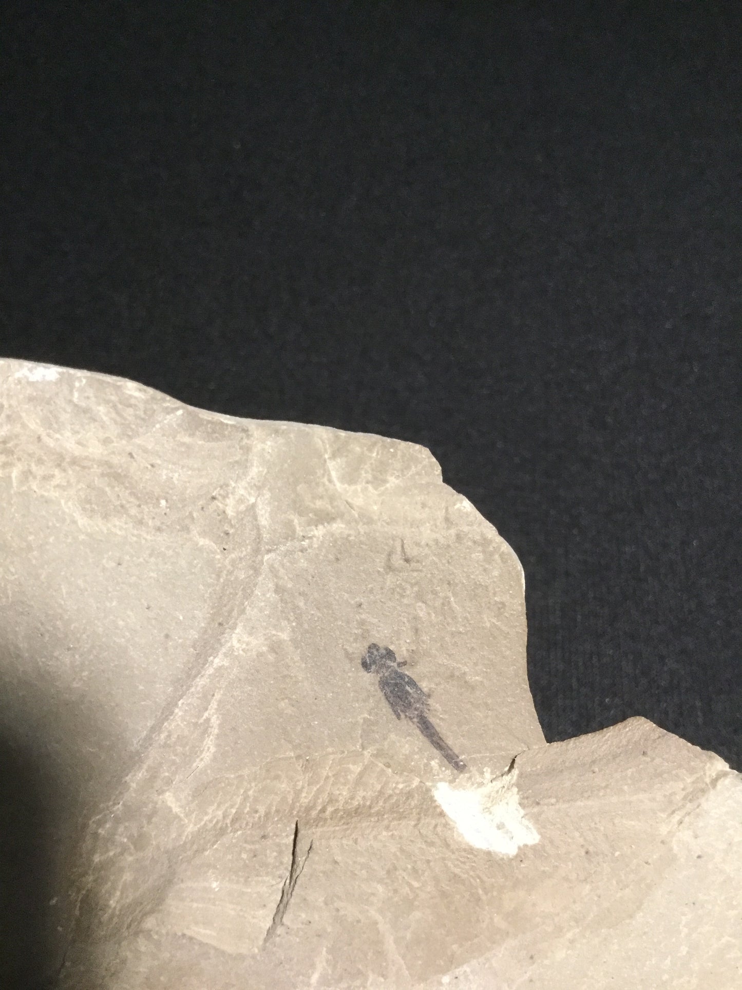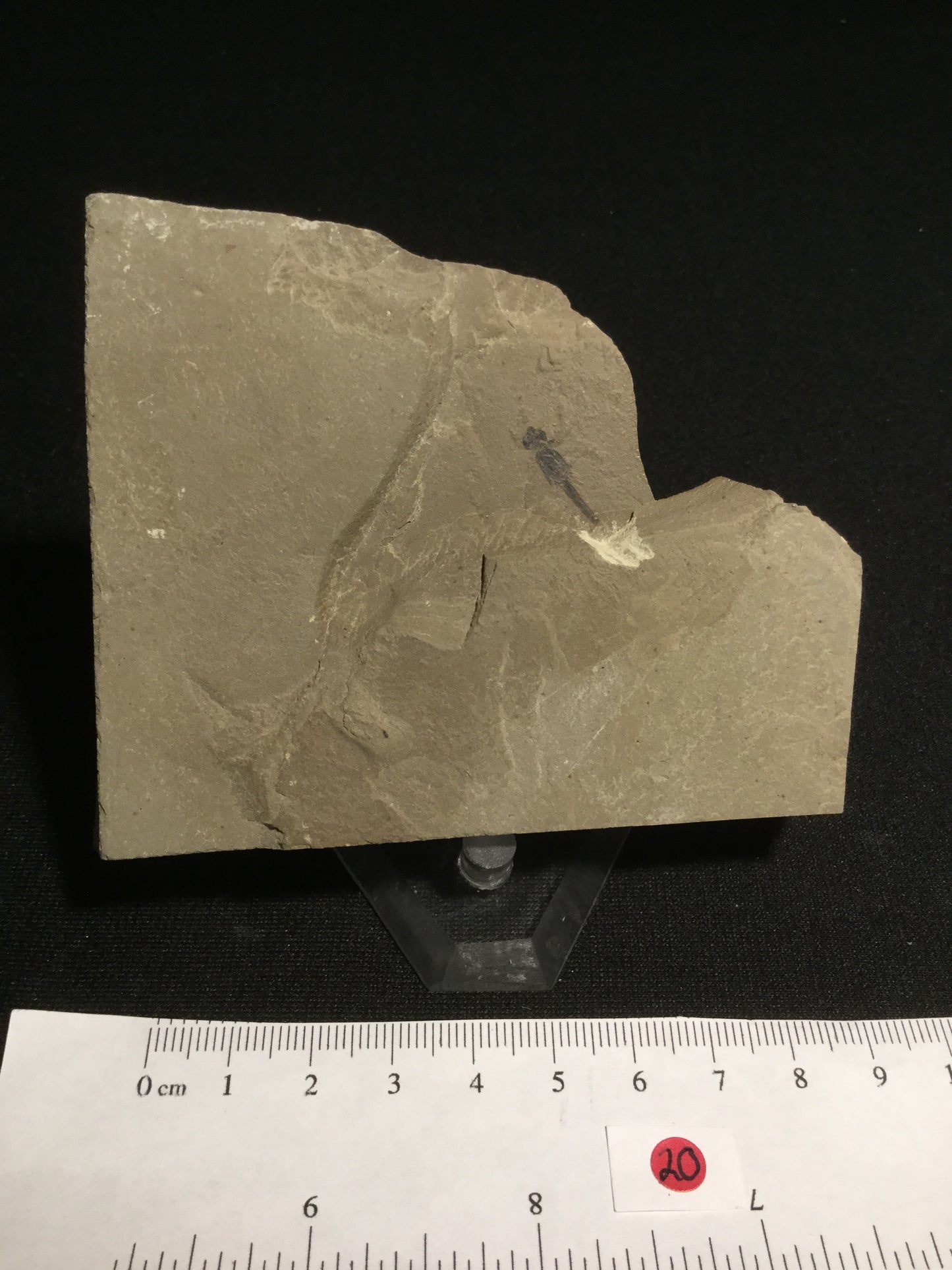 This specimen shows the thorax, abdomen and head of a robber fly. The legs are also preserved but the wings are missing. The head has very good detail. The slab has two Tipula sp. on the back.