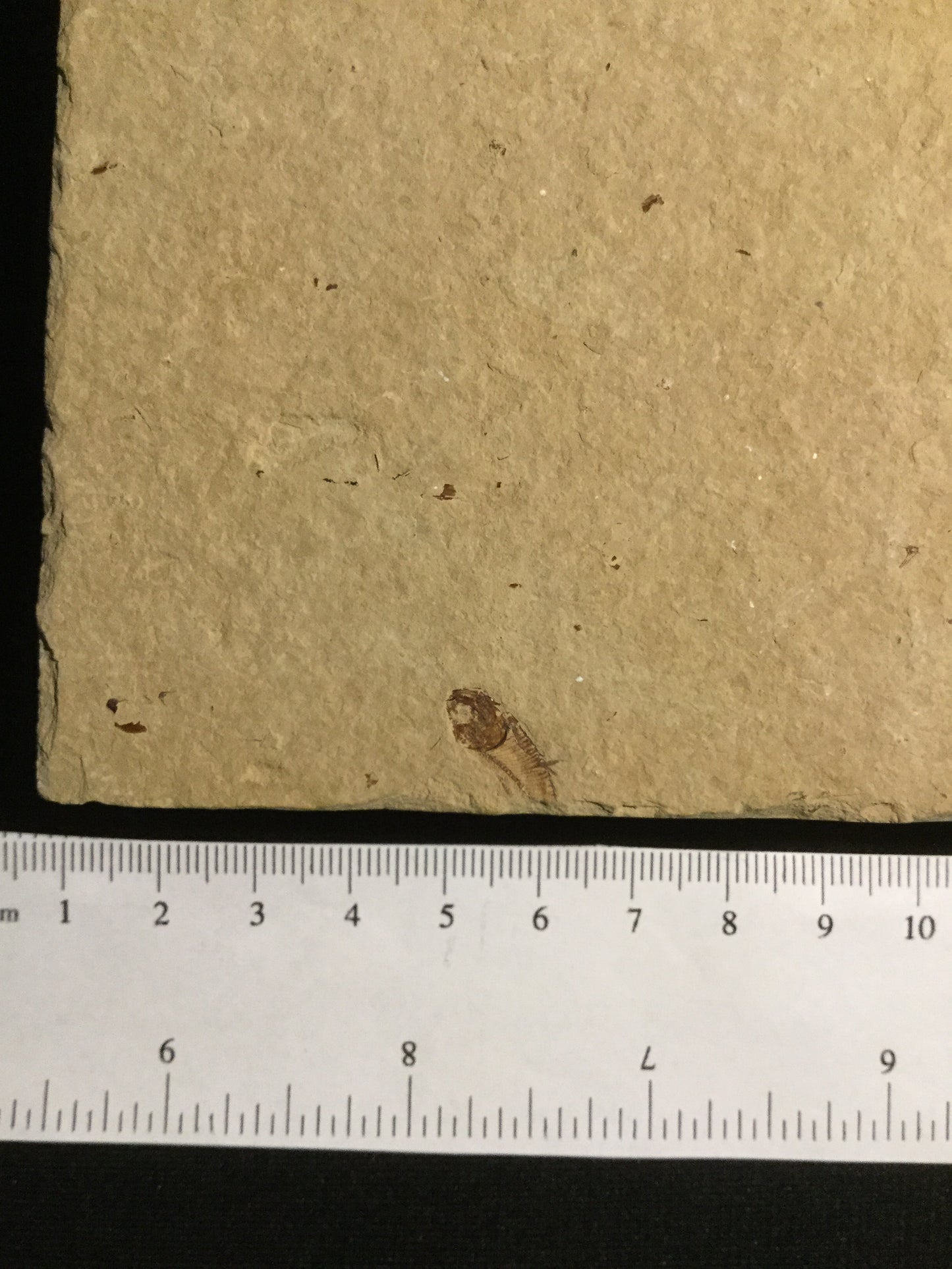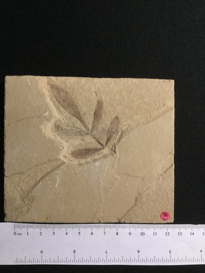 This specimen has 5 leaflets attached to the rachis. It may be a legume relative. On the back of the specimen there is a partial skeleton of a juvenile fish of the genus Knightia.