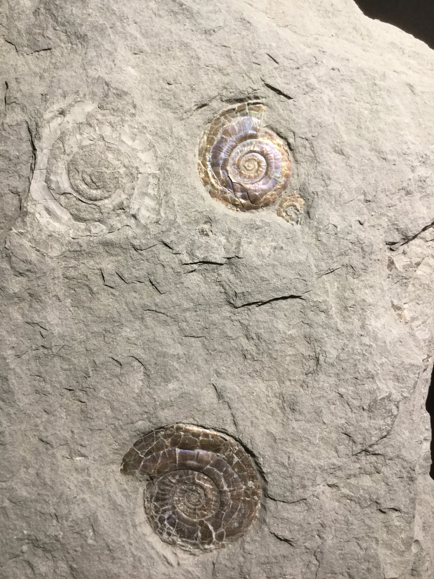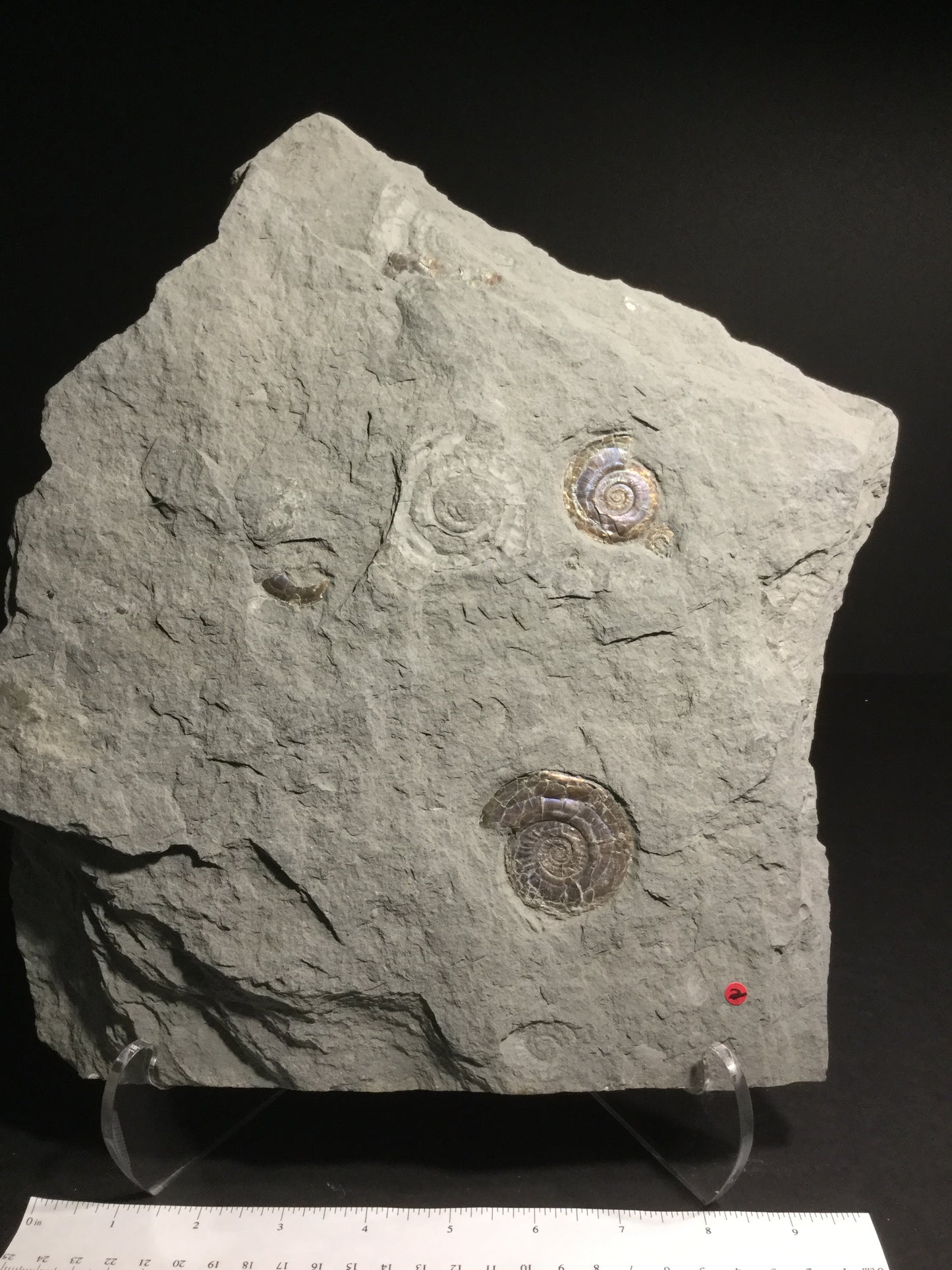 These thin-walled ammonites are crushed, as are most of the ammonites found in this locality. Flattening of the specimen has increased the area of iridescence of the shell, which is composed of alternating layers of aragonite and conchiolin or the minerals that have replaced them during fossilization. These not only transmit light but also diffract it, acting as a Rowland prism to divide light into its component parts while reinforcing certain wave lengths, in this case spectacular greens (and even some turquoise), much as the prisms do in satellites that study the chemical composition of the stars.