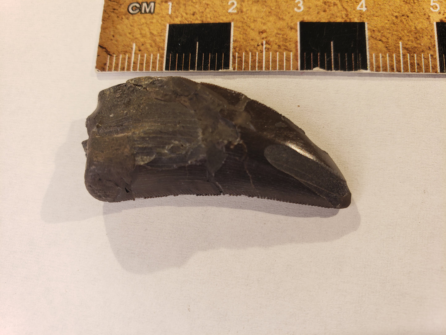 This is an interesting example of an Allosaurus tooth. This tooth is 3.7 cm long and 1.6 cm wide at the base of the tooth. There are excellent serrations on the mesial and distal carinae. The tip of the tooth shows a prominent wear facet on the lingual side and is complete except for 1 mm of restoration at the very end of the tip. There are distinct crenulations along the distal carina. There is a distinct deformation on the lower half of the lingual side of the tooth that appears to represent crowding from an adjacent tooth. Restoration is filling of the natural fractures. This is a very interesting specimen showing pathology.