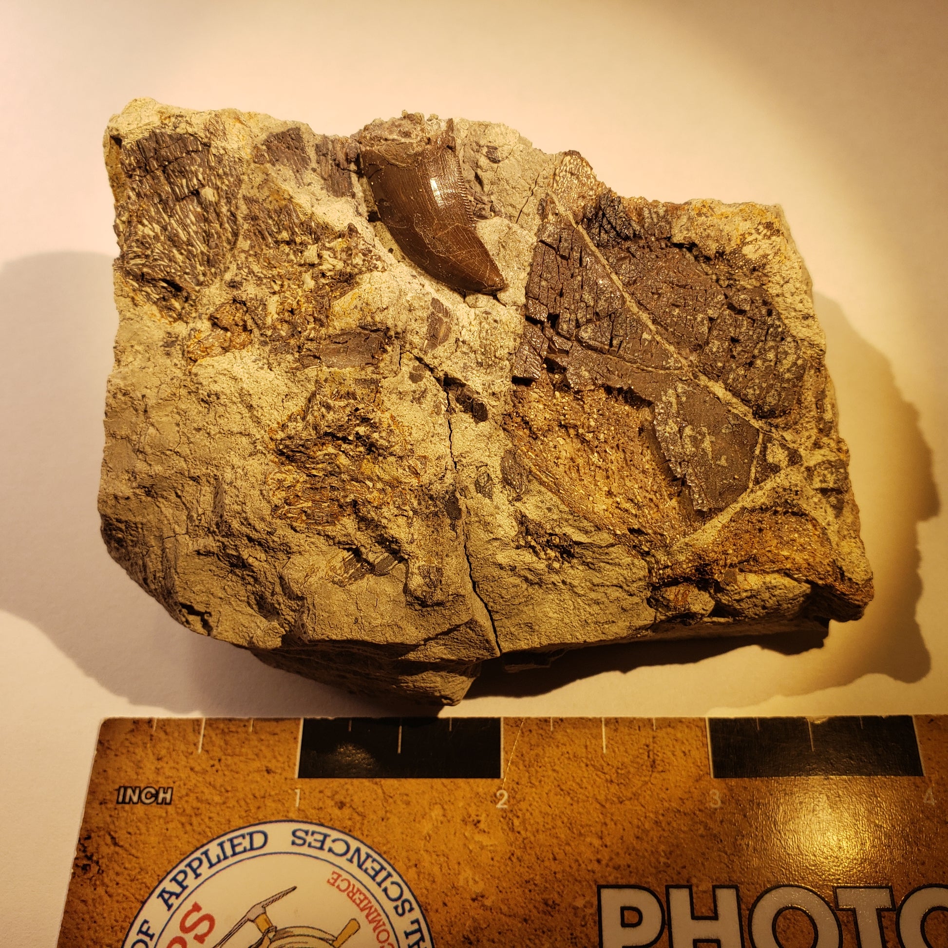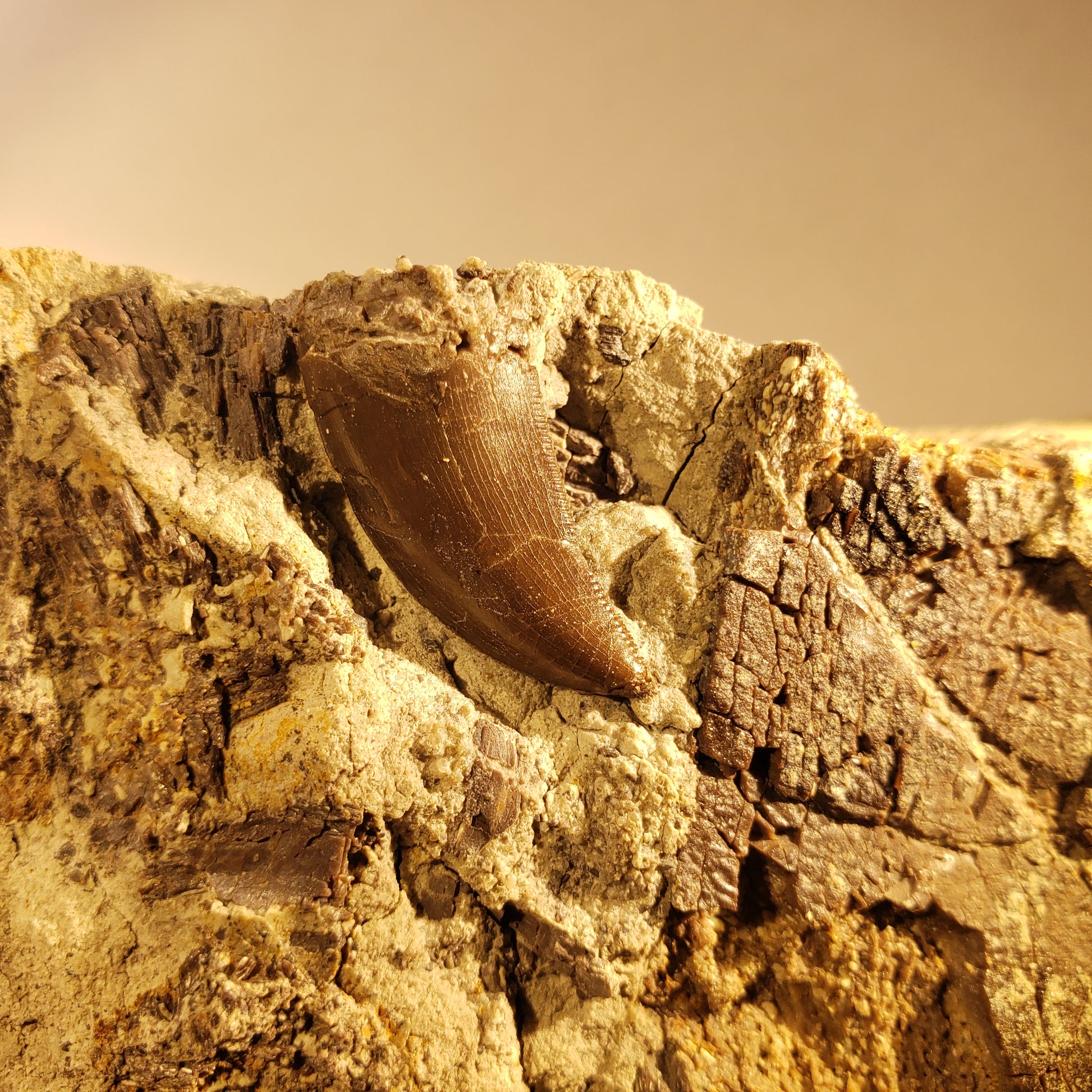 This is a very attractive example of an Allosaurus tooth prepared in its original matrix. This tooth is 2 cm long and 1 cm wide at the base of the tooth. There are excellent serrations on both the mesial and distal carinae. The tip of is complete. There are almost no natural fractures. The matrix contains other fragments of dinosaur bone and the scute of the Jurassic Morrison Formation turtle Glyptops. This is a very instructive specimen.