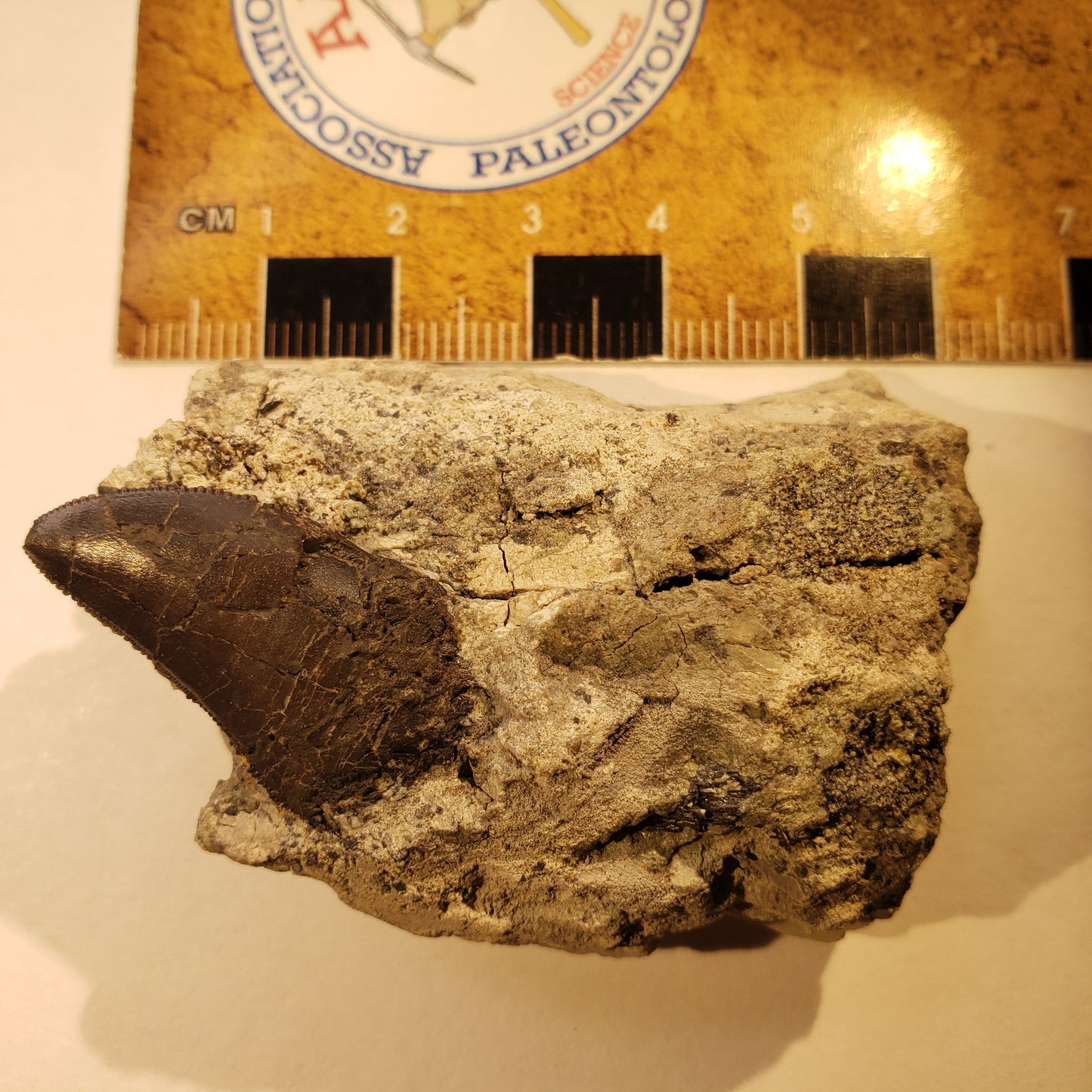 Here is a fine dinosaur tooth that we have interpreted to belong to the genus Torvosaurus. The tooth is 2.8 cm long and 1.5 cm wide at the base. It is somewhat recurved. The serrations on both mesial and distal carinae are excellent. It has 2 serrations per millimeter which is small for an adult Torvosaurus, however the serration characteristics are certainly not Allosaurus and unlike Ceratosaurus or Marshosaurus. This may represent a sub-adult animal. There is a very small ware facet at the tip. The mesial carina does not appear to reach the root. These features are characteristic of Torvosaurus. The tooth is prepared in its original matrix. There is filling of a few natural fractures. This specimen is a good example of a very rare genus.