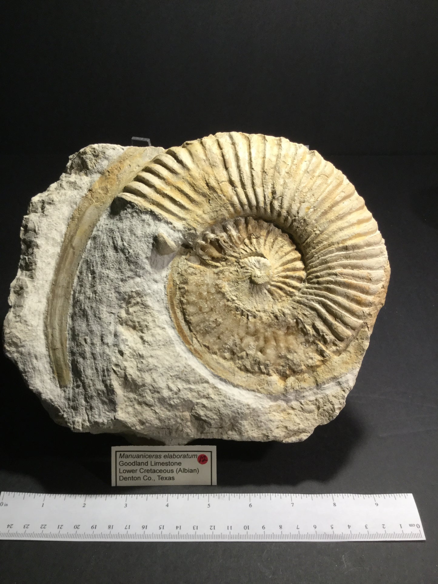 This incredible ammonite from the Goodland Limestone in Denton County, Texas is prepared in the original limestone matrix. Most examples of these ammonites are found free of matrix and consequently the rostrum and keel are rarely if ever seen preserved. This specimen has a magnificent 5-inch rostrum. Also present is a significant portion of the preserved keel. A portion of the ammonite is crushed and replaced with crystalline calcite. There is no restoration. This is a 1 in a thousand specimen because of the preserved features that are seldom seen in other specimens.