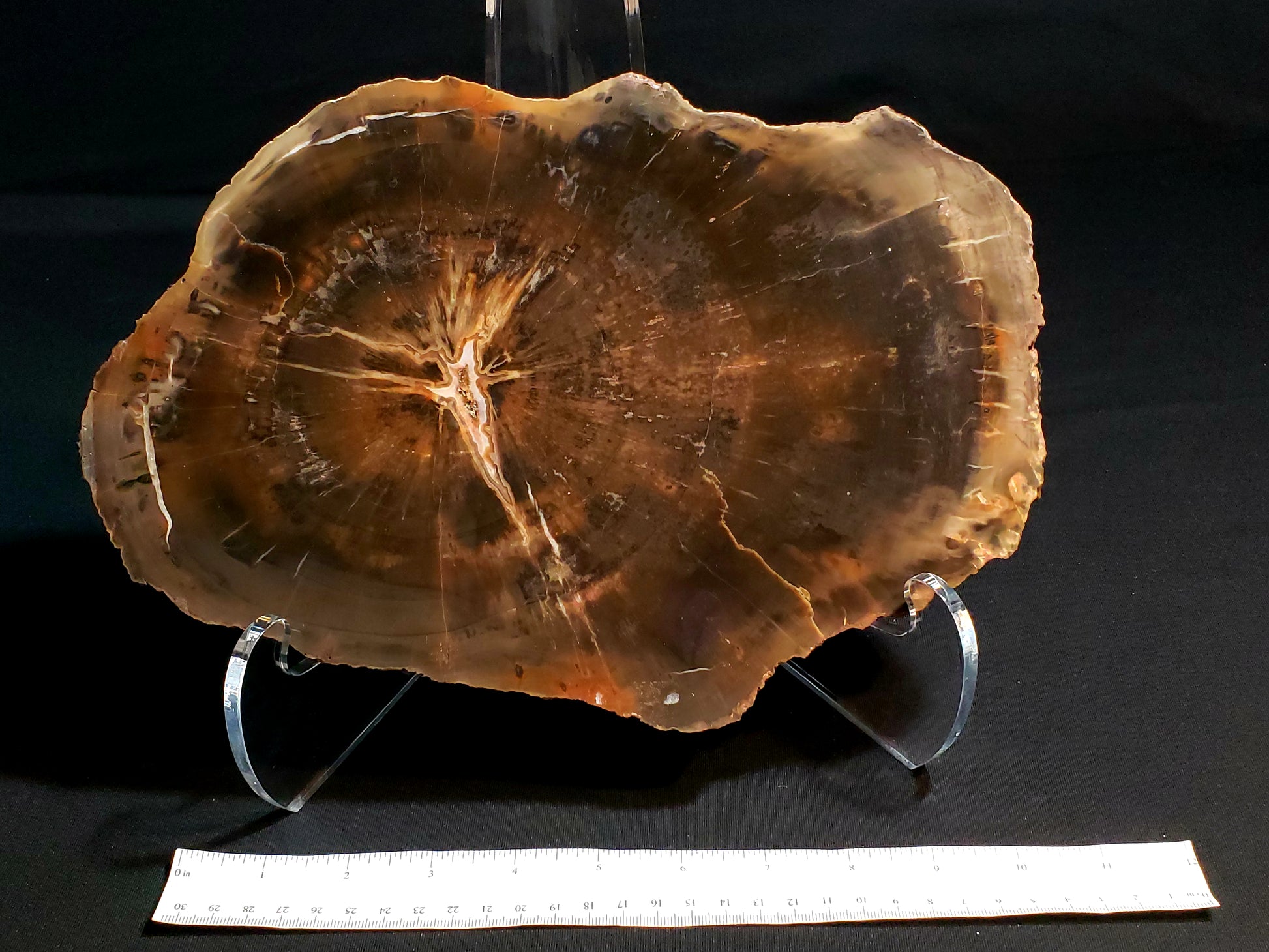 This specimen is a very colorful and well-preserved polished slab of the petrified wood cf. Araucarioxylon. This specimen has a very nice fortification agate pattern in the center. During fossilization there was a void at the center of the tree trunk that filled with agate. The slab is 11.75 by 8 inches and has excellent preserved detail. The slab is 5/8 inch thick. The specimen makes an excellent display on an easel stand.