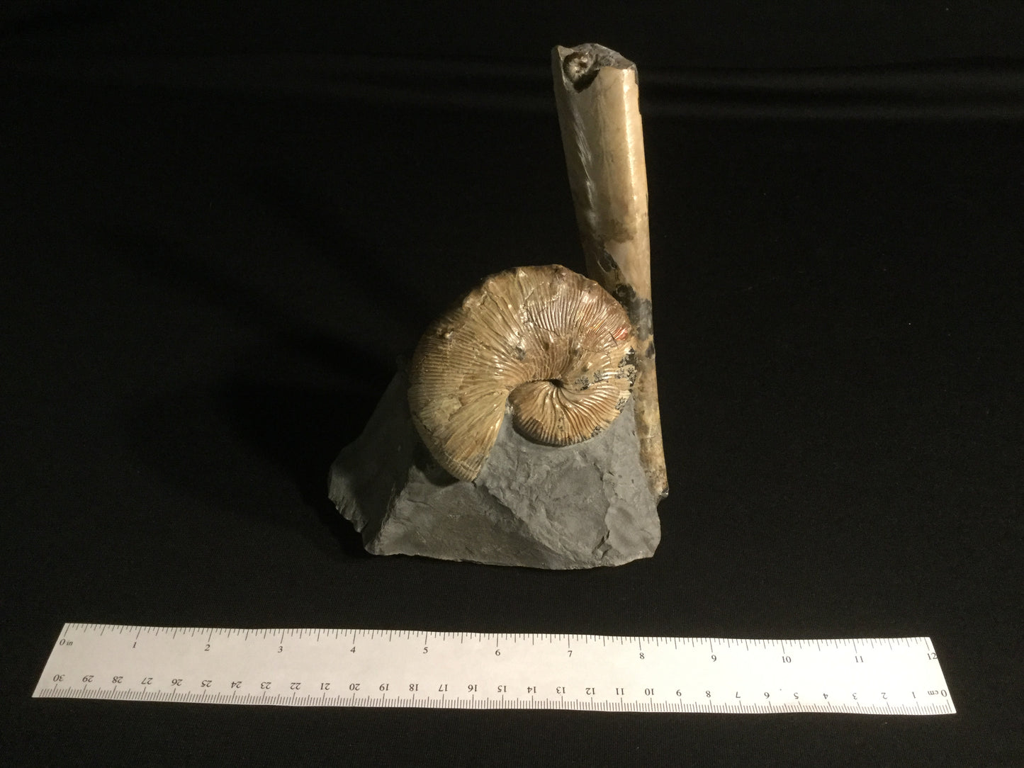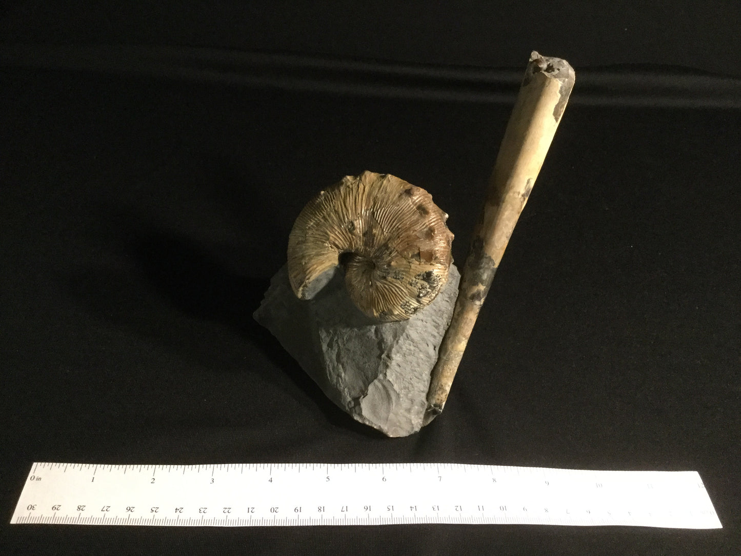 Seen here is an excellent example of the macroconch form of H. brevis. The specimen has the original shell, and it has some red iridescent on the living chamber. Some of the sutures are visible on the phragmocone. This specimen has very well-defined nodes typical of the species. It is complete all the way to the aperture. The specimen has no repair. The ammonite is 3.25 inches. It is prepared on its original matrix and has a 7-inch section of B. compress associated. The baculite has almost a complete living chamber and 2.5 inches of phragmocone. As an added bonus there is an immature scaphite within the living camber of the baculite. The baculite is repaired