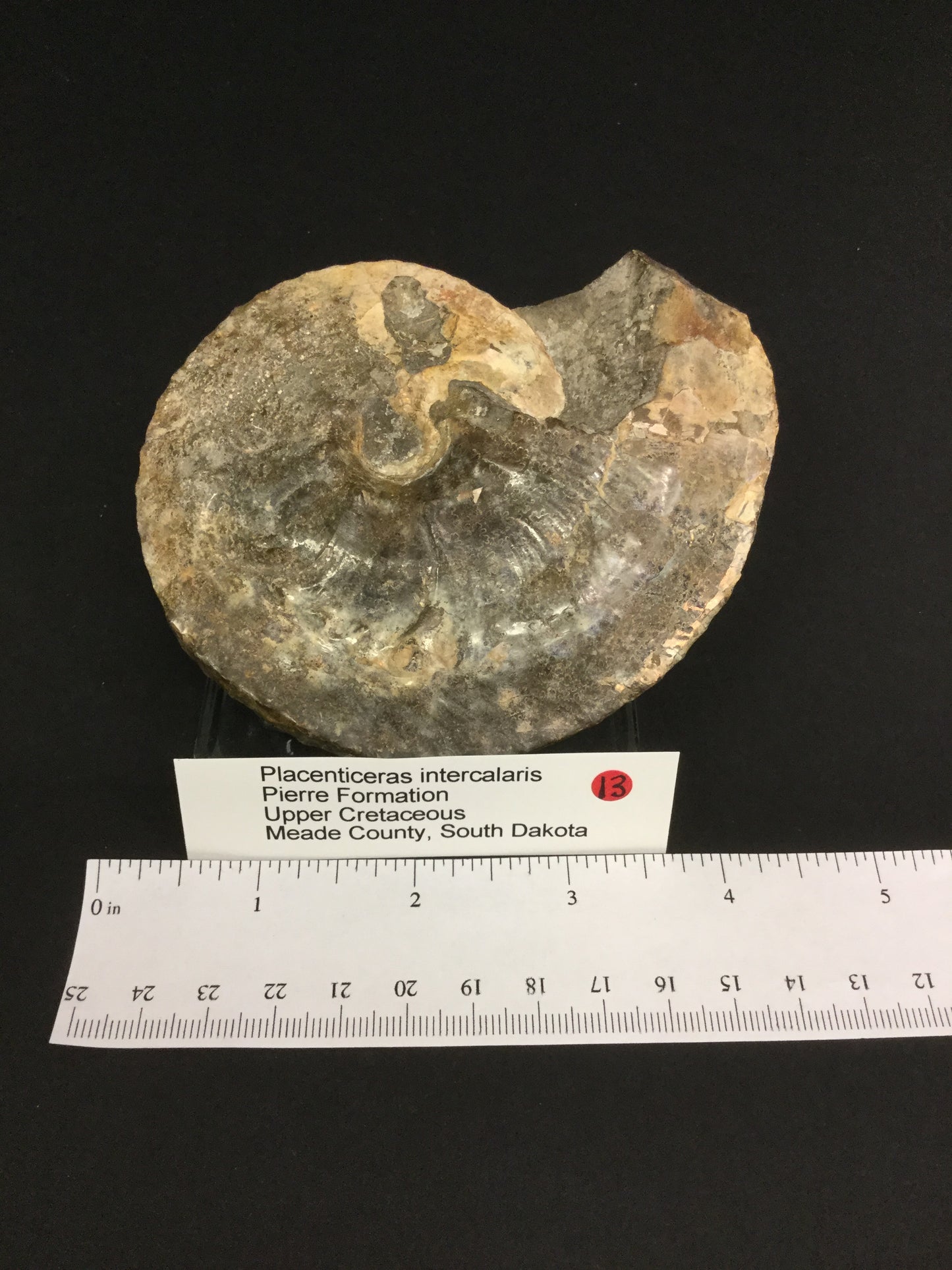 This example of P. intercalare has well defined features characteristic of the species. The specimen has a nearly complete body chamber and some sutures are visible. The ammonite shows sign of injury pathology and makes this specimen of particular interest. The ammonite is 4.5 inches across.